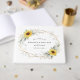 Design features watercolor greenery, sunflowers, printed gold elements and airy botanical leaves over a printed gold coloured geometric frame. The back features a matching greenery and sunflower small bouquet.