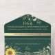 Celebrate your summer wedding in style with this elegant emerald green and gold all-in-one invitation featuring golden sunflowers, botanical accents, and a heart-shaped rope monogram. The deep green background offers a bold contrast to the soft beige RSVP section, while the back flap includes monogram initials and delicate floral details. A radiant and romantic design for rustic, sunflower, or countryside weddings.