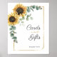 Our sunflower eucalyptus floral and geometric frame cards and gifts sign is perfect for a country barn wedding or bridal shower. The bohemian floral design features yellow sunflowers, gold foil geometric leaves and frame, and hunter green eucalyptus greenery in watercolor with an elegant modern rustic look.