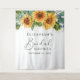 Rustic bridal shower backdrop tapestry and photo booth prop featuring watercolor bouquets of sunflower florals and eucalyptus greenery, a stylish calligraphy script and the bride's name in elegant serif typography.