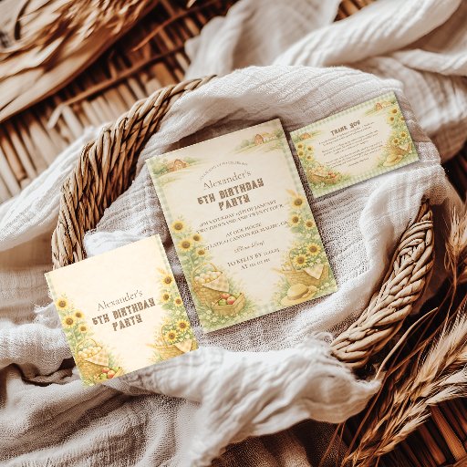 A whimsical storybook-style farm birthday design featuring a classic red barn, rolling green fields, hay bales, and friendly farm animals. The warm countryside illustration creates a cozy, timeless celebration feel, with a balanced layout and a clear center space for easy personalization. Perfect for kids who love animals, farms, and outdoor adventures.