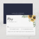 Elegant watercolor sunflower and eucalyptus bouquet, wedding RSVP cards. Card features, solid navy blue colour backing and food allergy note on front.