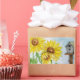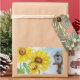 Original watercolor painting by Sandra Gale, featuring a group of sunflowers and a gardener's bag, hat and shovel. Great design for gardeners of all types and a perfect image of summer!