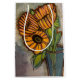 Brightly coloured flowers with bold outlines are arranged in a blue vase, exuding a lively and vibrant feel. The background features soft, muted tones, which enhance the vividness of the flowers' petals and leaves.