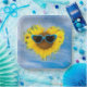 Yellow sunflower with heart sunglasses in a heart-shaped abstract frame on a summer sky background.