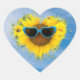 Yellow sunflower with heart sunglasses in a heart-shaped abstract frame on a summer sky background.
