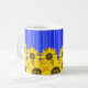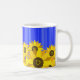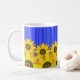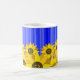 Lots of sunflowers against a blue background. The sunflowers show their love with hearts in the centre of them.