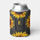Elegant stylish bright yellow sunflowers bouquet can cooler with a signature script calligraphy name and monogram initial over a dark brown barn wood rustic modern background. ++++++++ Could be a nice keepsake gift for a bridal shower, birthday, Sweet 16, bachelorette party, wedding team bride, bridesmaids, or maid of honour.