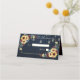 Create the perfect reception setting with this warm,trendy place card design featuring sunflower, navy blue and burgundy watercolor floral design, featuring navy blue & burgundy wood backgrounds, sweet string lights. Perfect for fall and winter weddings. Copyright Elegant Invites, all rights reserved.