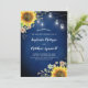 These wedding invitations feature a rustic sunflower design with flowers and mason jar sting lights on a navy blue background. Personalise them with your own text.