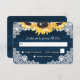 Romantic navy blue rustic floral wedding RSVP card featuring sunflowers, white floral lace and string lights against a rustic wood background. Perfect card design to complement your navy blue rustic wedding party inspired by sunflower flowers.
