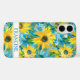 Customize this colorful modern sunflowers on teal painting iPhone 16 plus case with your your name in a trendy modern CAP font in teal on white. It's so beautiful and happy!
