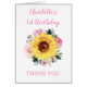 These 1st birthday thank you cards feature a sunflower and pink floral watercolor design. Personalise the front with a name. Add your thank you message on the inside of the card. Other matching birthday party products are also available.