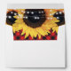 Red buffalo plaid floral envelopes with a return address featuring sunflower flowers and string lights on a red chequered background. Matching items available.