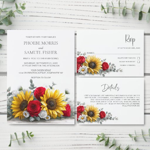 Sunflower Red Rose Floral Wedding RSVP