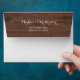 This rustic country design features golden white string lights, yellow sunflowers, maroon burgundy red roses, and white baby's' breath on the inside of the envelope against a dark brown barn wood background. A customisable name and return address appear on the back in golden white in popular script and serif typography on the same dark brown wood background. You can personalise this invitation for your own wedding by changing the text in the template.