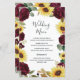 Design features beautiful watercolor sunflowers and burgundy red roses with elegant eucalyptus and other greenery elements.
