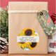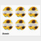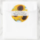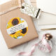 Sunflower return address labels in round shape. Yellow sunflower bouquet over blue sky image is the background for name and address in fun, black printed text.