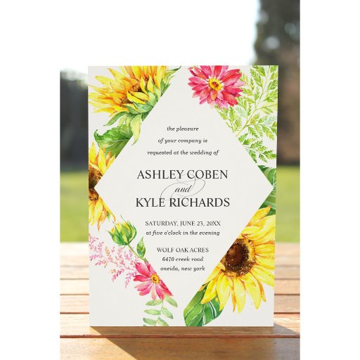 Sunflowers cascade from the top of the Save the Date card in yellow with pops of pink and greenery. The back of the card has a light yellow watercolor stripe background. Add your wedding details and your friends and family will save the date! This matches a collection in my store.