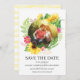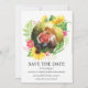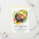 A gorgeous sunflower wreath with pops of pink accent flowers and greenery frames your save the date photo. Add your details and photo. The back of the card is decorated with pale yellow watercolor stripes.