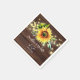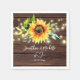 Rustic Wedding Napkin depicts floral watercolor yellow sunflowers and greenery with string lights and dark wood background. Features names of bride and groom, heart with arrow and date._