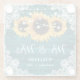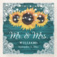 Personalised teal rustic wood and sunflower wedding glass coasters featuring sunflowers on a barn wood background adorned with white floral lace and string lights. Matching items available to complement these teal rustic floral wedding glass coasters.