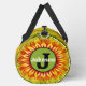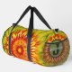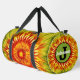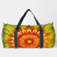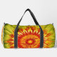 This vibrant Gear bag features a bold Tie Dye pattern reminiscent of sunflowers, with radiating designs in sunny yellow, fiery red, and touches of green. It's a cheerful Kit bag and a stylish Weekender for your journeys.