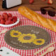 Sunflower trio - personalized paper plates for rustic weddings . Three sunflowers arranged in a row . Unique design in harvest time mood . By Alma Wad . It comes with burlap look background .