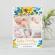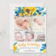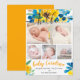 A modern, simple and elegant yellow, blue sunflowers and blooms loose floral watercolor baby birth announcement with 5 photo grid collage, and an elegant typography calligraphy, with hello baby name. Introducing baby!