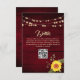 Elegant, gold string lights on rustic wood burgundy wedding details card with QR code for more information and sunflower.