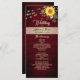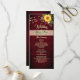 Country, elegant, modern, country, rustic wood burgundy wedding menu with sunflower, gold gilded floral lace and string lights. Perfect choice for fall weddings.