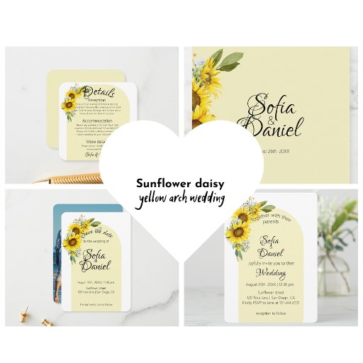 A sunflower, a radiant bloom reminiscent of summer days, finds harmony with the pristine white petals of a daisy, their contrasting colours creating a captivating visual. These floral elements are thoughtfully arranged alongside a sunny yellow arch, a cheerful structure that adds a touch of warmth and sophistication. When combined, these carefully selected components – the vibrant sunflower, the delicate daisy, and the sunny yellow arch – come together to form an elegant invitation, suggesting a celebration filled with beauty and joy. The invitation subtly hints at the natural world, promising an event marked by grace and a welcoming atmosphere, where the charm of sunflowers and daisies intertwines with the cheerful embrace of a yellow arch.