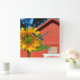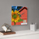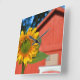 A sunflower stands against the backdrop of a red barn with an American flag. The sunflower (Helianthus annuus) is an annual plant native to the Americas. The sunflower is the state flower of Kansas. On the back of the card, a honeybee visits a sunflower. Honeybees are important pollinators.