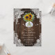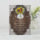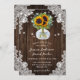Rustic sunflower wedding invitation featuring a sunflower bouquet inside a vase against a rustic wood background adorned with white floral lace and string lights. Perfect card design for inviting your guests to your rustic-themed summer wedding party inspired by sunflowers.