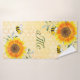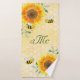 Yellow, white background with a honeycomb pattern. Decorated with watercolored rustic yellow and orange sunflowers and happy bumble bees. Add your own monogram initials as a married couple. Your family name's initial in the middle with a capital letter.