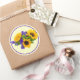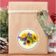 Round sticker with an image of three bright yellow sunflowers and blue seas statice on soft yellow with a purple border. This variety of statice produces large clusters of deep blue flowers over a long season, perfect for using in both dried and fresh flower arrangements. The sunflower (Helianthus annuus) is an annual plant native to the Americas. It possesses a large inflorescence (flowering head), and its name is derived from the flower's shape and image, which is often used to depict the sun. See matching confetti and wrapping paper. See the entire Flowers & Plants Sticker collection in the CARDS, POSTCARDS & STICKERS section.