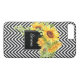 A cheerful modern design featuring a black and white chevron zig-zag stripes pattern with a floral monogram frame edged in colourful yellow watercolor sunflowers. Edit the sample name with your desired name for a custom phone case that is uniquely yours.