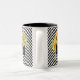 A cheerful modern design featuring a black and white chevron zig-zag stripes pattern with a floral monogram frame edged in colourful yellow watercolor sunflowers. Edit the sample monogram shown on both the left and right side with your initial for a custom mug that is uniquely yours.