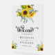 Elegant wedding welcome sign featuring beautiful sunflowers and eucalyptus leaves.