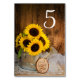 Add a touch of charm to your casual country ranch theme bridal shower barn party or marriage reception with the pretty Sunflowers and Garden Watering Can Wedding Table Numbers. These rustic chic table number cards feature a quaint digitally enhanced floral photograph of a bouquet of yellow sunflower blossoms in a silver metal watering can, white bridal veil, vintage lace trimmed linen handkerchief and natural wood slice with the word LOVE burned on it with a burlap and brown weathered barn wood background.