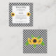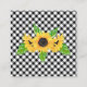 Rustic boho sunflowers on a black-edged white panel above a diagonal black and white buffalo check background in this cheerful summer into fall "Books for Baby" baby shower book request design. Composite design by Holiday Hearts Designs (rights reserved).