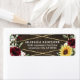Design features a printed barn wood grain background with a geometric gold coloured frame that's decorated with burgundy red roses, blush floral elements, sunflowers, eucalyptus and other greenery.