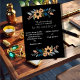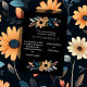 This wedding card design showcases a charming floral arrangement featuring sunflowers and complementary foliage, all set against a sleek black background. The design is divided into two clusters, one at the top and one at the bottom, creating a balanced frame for the central text. The sunflowers, with their warm orange petals and dark centres, are surrounded by muted blue and grey leaves, along with soft peach accents, adding a touch of rustic elegance. The overall aesthetic is a blend of modern sophistication and natural beauty, making it an ideal choice for a wedding with a contemporary yet earthy theme. Personalise the card with your names and details of the wedding. You can download the card to your mobile device or computer. Card was created with help of ai.