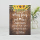 Elopement wedding party invitation with rustic wood base, fairy lights, and sunflowers. Make it your own by adding your text (and personal photos). To access advanced editing tools, please go to “Personalise”, scroll down and press the "click to customise further" link. For more matching designs click the link “Other products from this collection”.