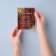 A modern, elegant, wedding program, timeline. Rustic brown wood as background. Decorated with sunflowers, green watercolored eucalyptus greenery. Personalise and add your names and wedding details. If you have more text it's possible to reduce the line space, and remove the decor on the back.