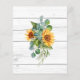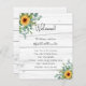 A modern, elegant, wedding program, timeline. Rustic white wood as background. Decorated with sunflowers, green watercolored eucalyptus greenery. Personalise and add your names and wedding details. Black coloured letters. If you have more text it's possible to reduce the line space, and remove the decor on the back.