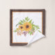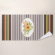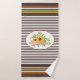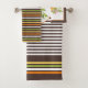 Watercolor sunflowers, fall leaves, berries and stripes bath towel set. It features yellow watercolor sunflowers, fall leaves and berries. There is a brown and white striped pattern around it in brown accented with orange, yellow and green stripes.