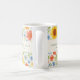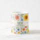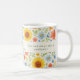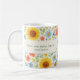 A mug decorated with a floral pattern with sunflowers. Text: Rise and shine like a sunflower. Personalise and add your monogram initials and name.