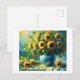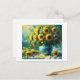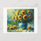 A vibrant bouquet of sunflowers and blue flowers is arranged in a round blue vase, set against a swirling background of greens and blues. Bright sunlit petals and scattered small objects create a lively and dynamic composition.