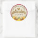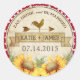Sunflowers with red gingham check background and a rooster weather vane rustic country picnic wedding label design.